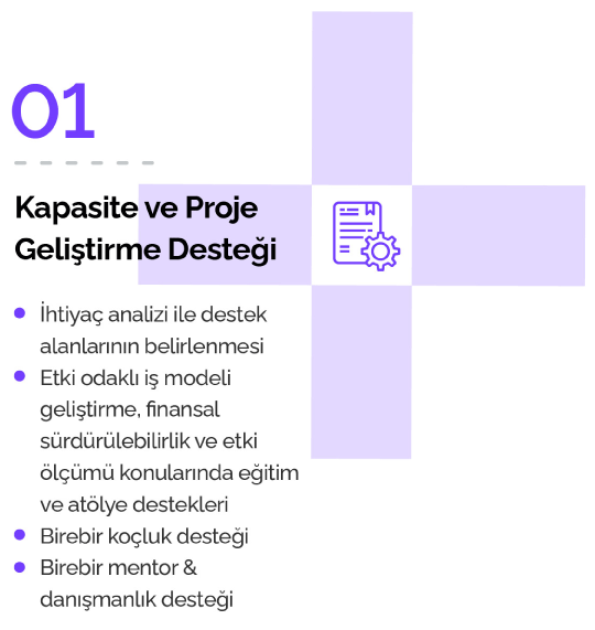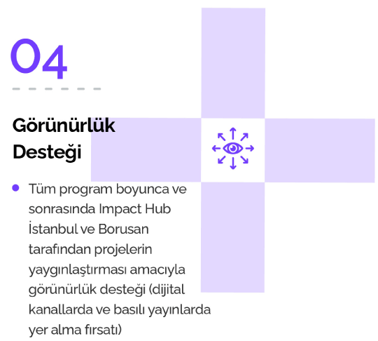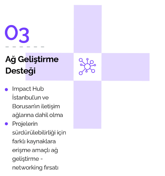 Seçilecek proje ekipleri, 6 ay sürecek proje geliştirme süreci boyunca Borusan sponsorluğunda ve Impact Hub İstanbul ortaklığında aşağıdaki destek alanlarından yararlanacaktır.
